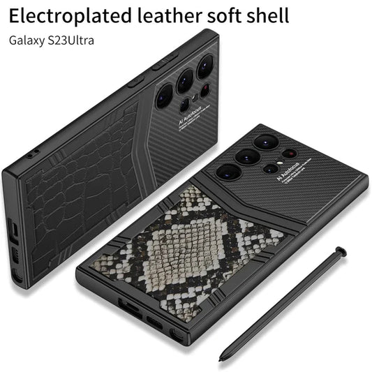 Hybrid Shockproof Rugged Armor Electroplated Soft TPU Silicone PU Leather Protective Cover with Pen Slots Phone Case for Samsung Galaxy S23 Ultra 5G ƒ?? Snake skin texture
